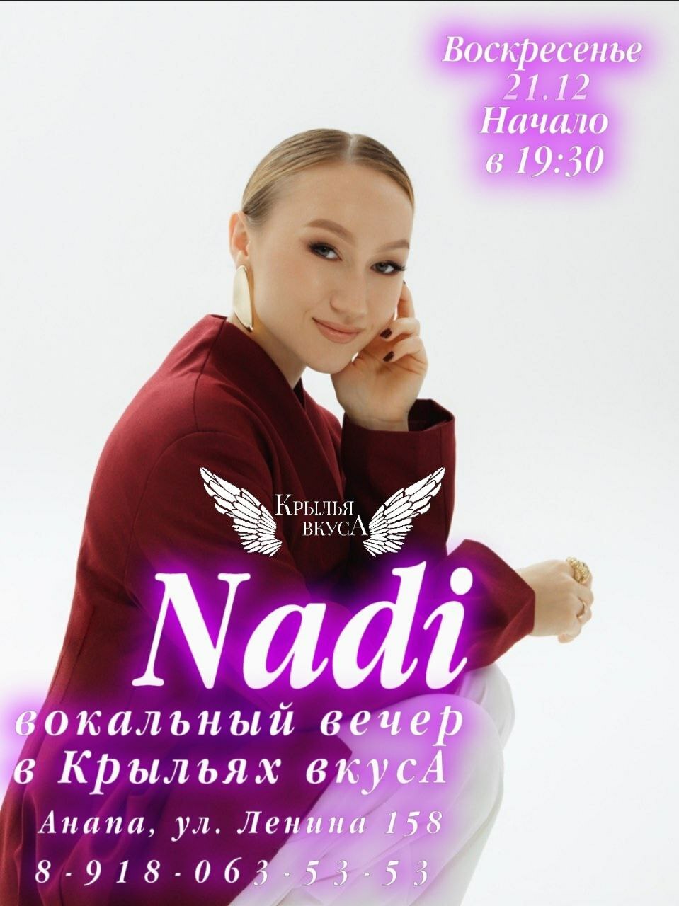 Великолепная Nadi🎤🎶 сегодня украсит вечер музыкальной программой в кафе "Крылья вкусА"🪽Начало в 19:30.